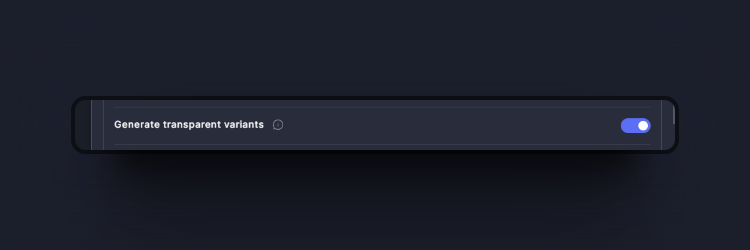 By checking this option, you can automatically generate 9 transparent variants of the selected color. If your color variable is --primary, then you can use `--primary--10` (meaning 10% transparency) through to `--primary-90`.