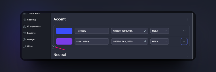 To add a new color, simply click the plus (+) icon under the last color in the group.