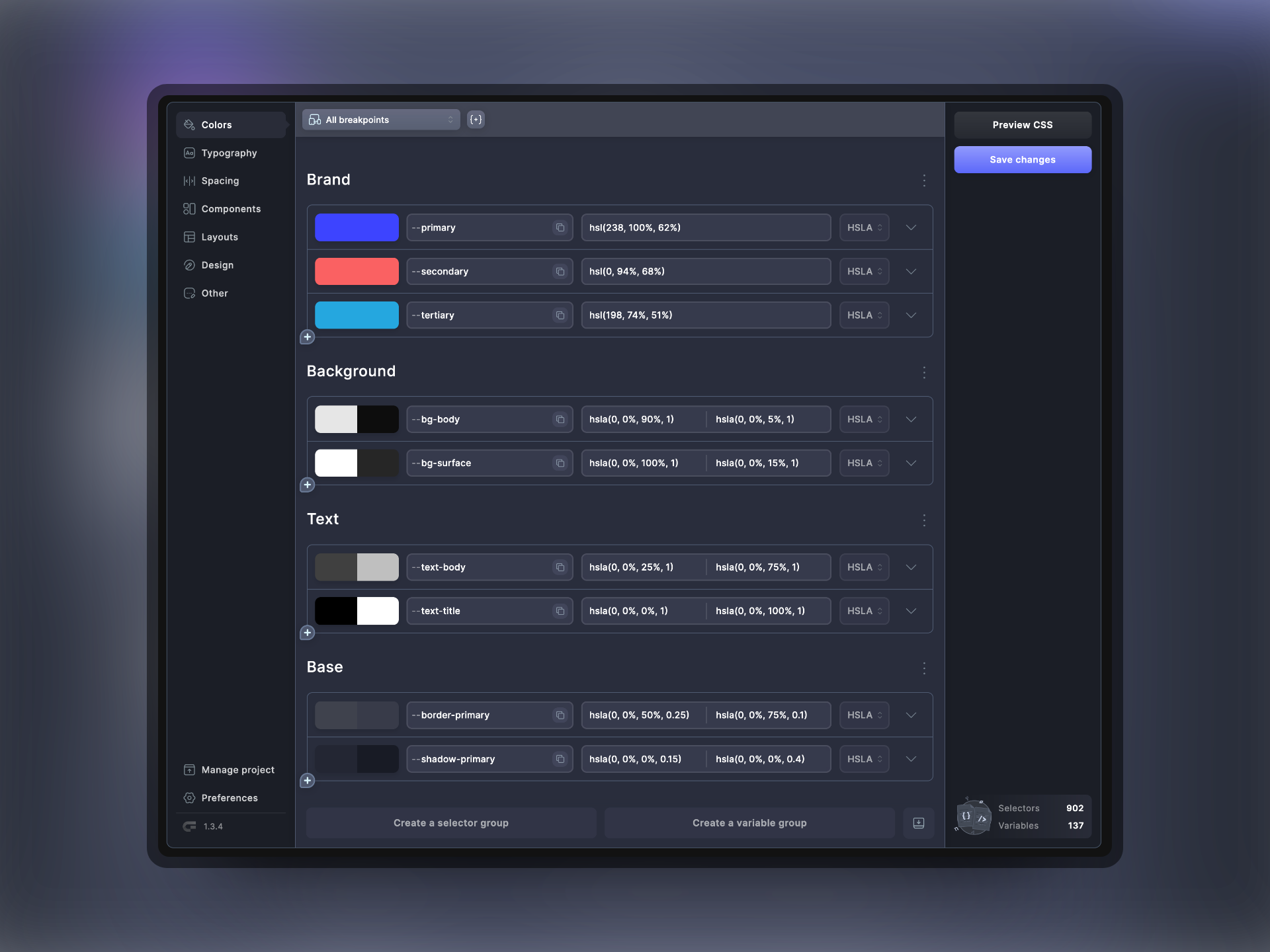 With our color management system, you can set your variable names for each color and also sort your colors into groups. By default, our framework comes with multiple groups ranging from ***brand*** colors, to ***text***, ***background***, ***base*** colors and more. You can add more groups by clicking on the ***Create new color group*** button at the bottom.