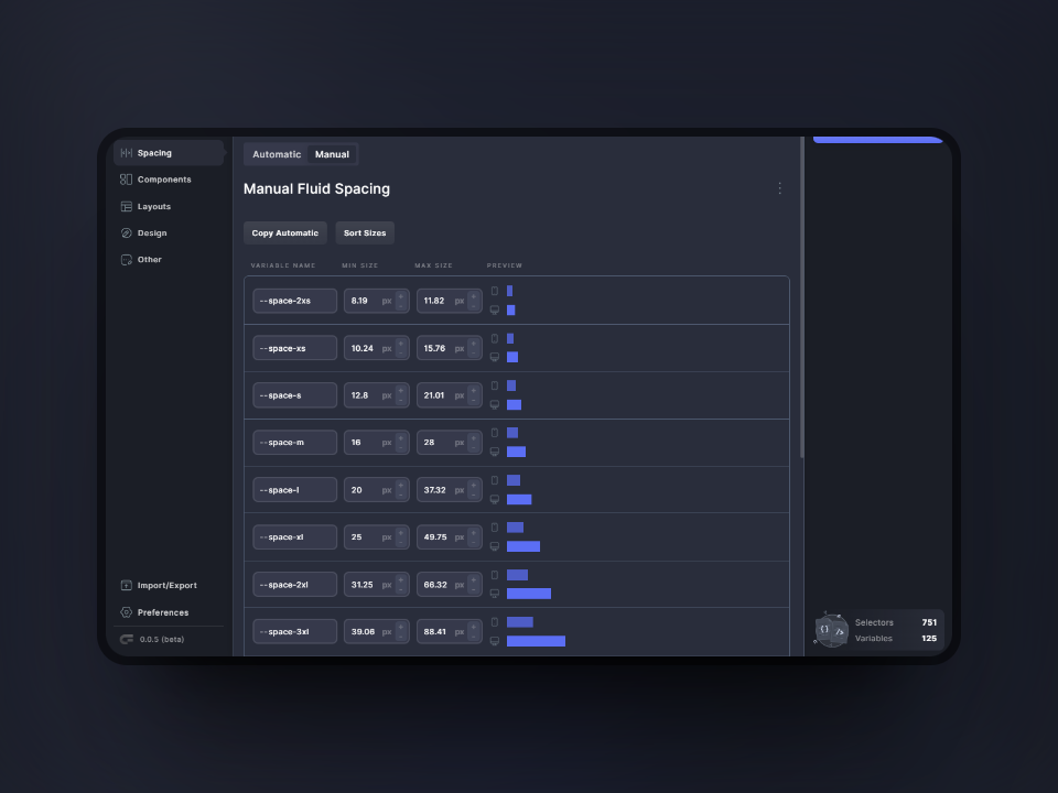 Users have the flexibility to name variables according to their preferred naming conventions. As a result, the suffixes appended to variables may differ from the conventional designations (e.g., -s, -m, -l, -xl) utilized in our class generation logic. Consequently, we have decided to remove this feature from the manual tab.