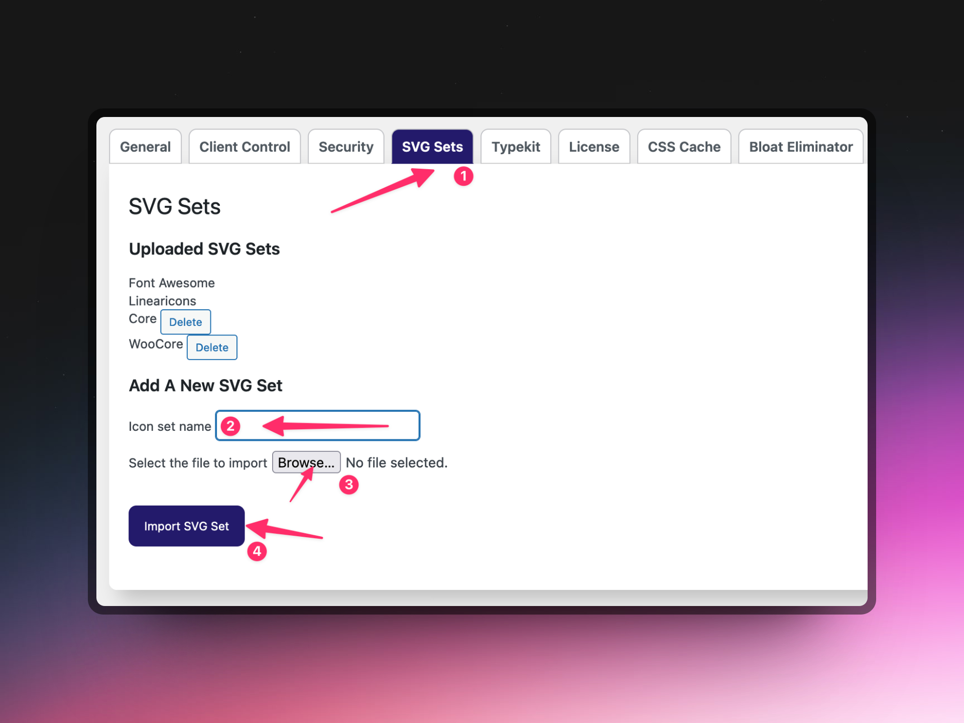 3. Next, navigate to the SVG Sets tab, enter an appropriate name for your SVG set (Core or WooCore), click browse to find the respective symbol-defs.svg file, and click on Import SVG Set.